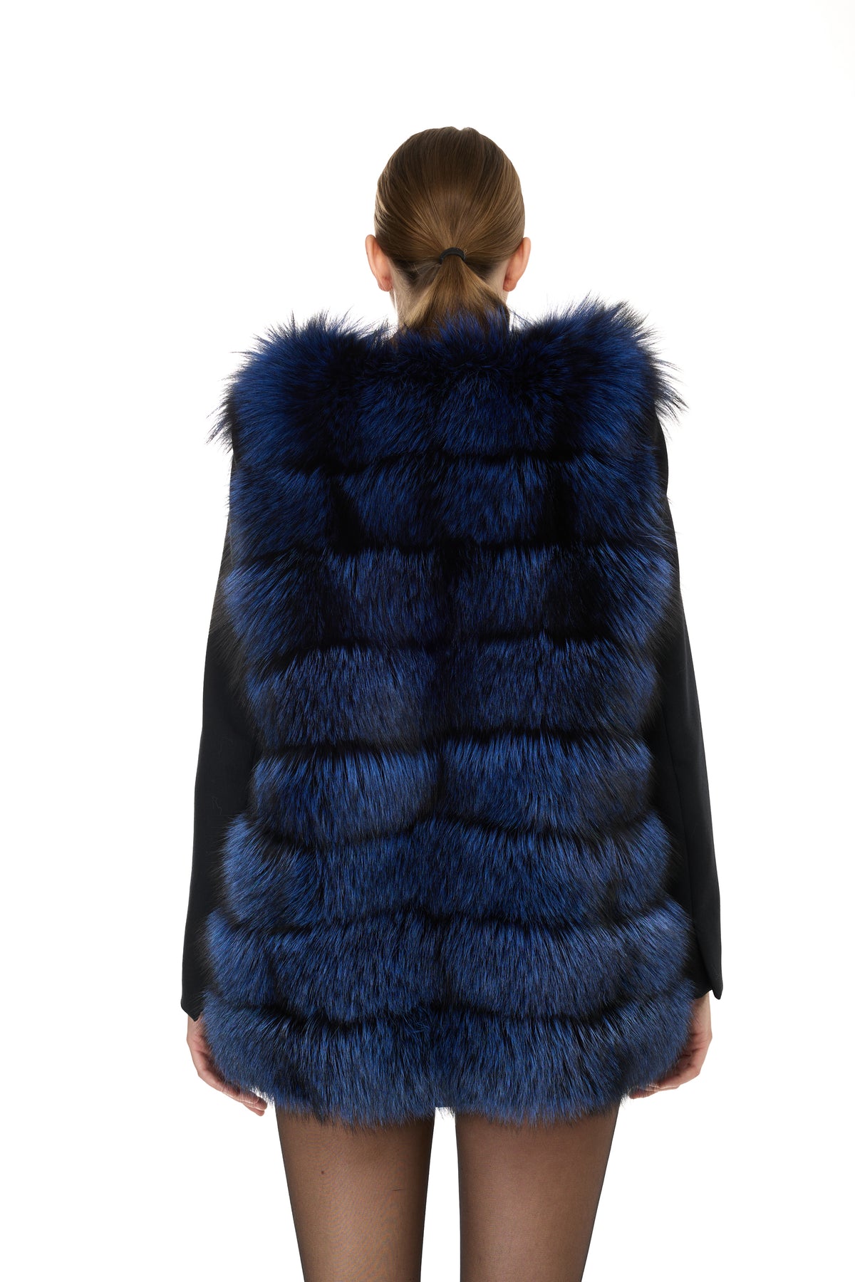 The Silver Fox & Denim Vest in Sapphire Blue is a refined luxury piece that combines the natural beauty of silver fox fur with the casual sophistication of denim.