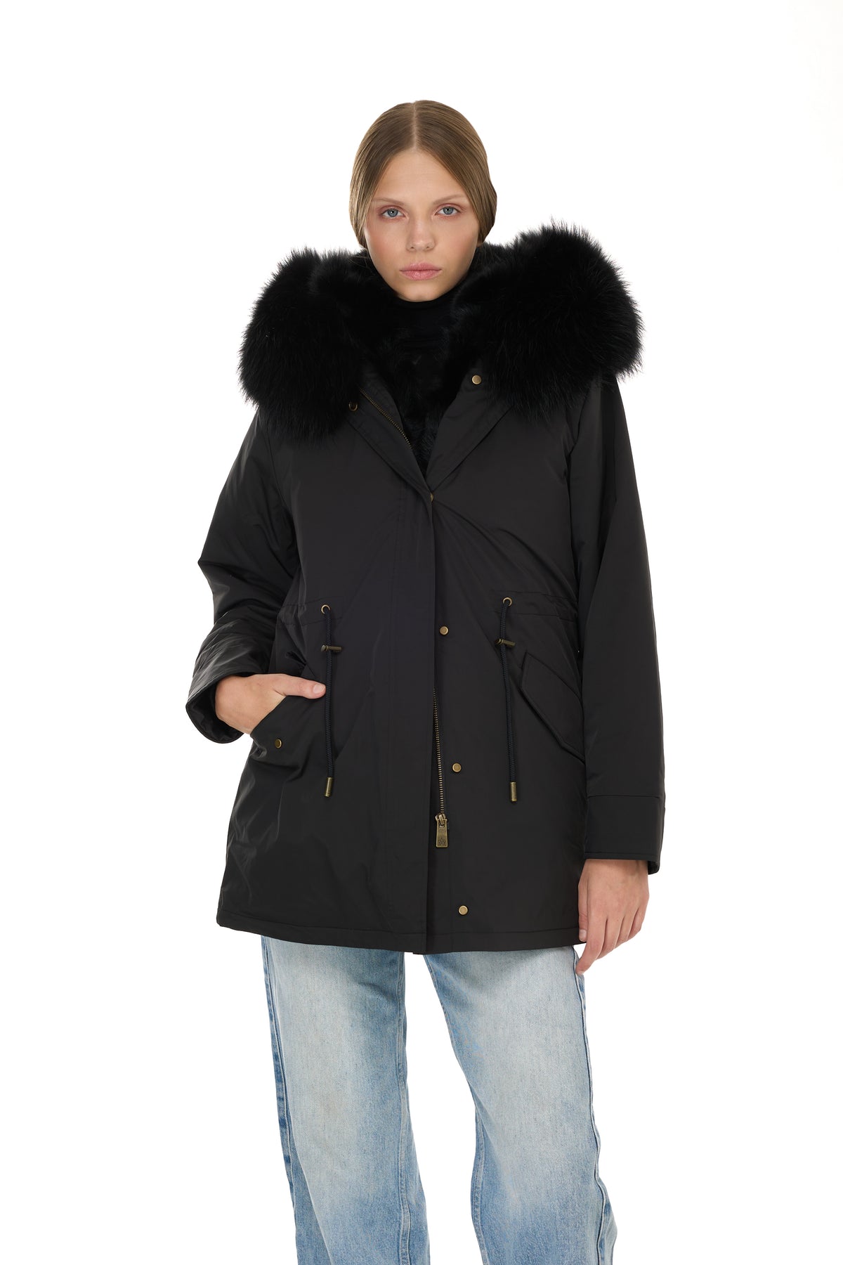 防水コットンブレンドの都会のロングパーカコヨーテファーベスト - ブラック