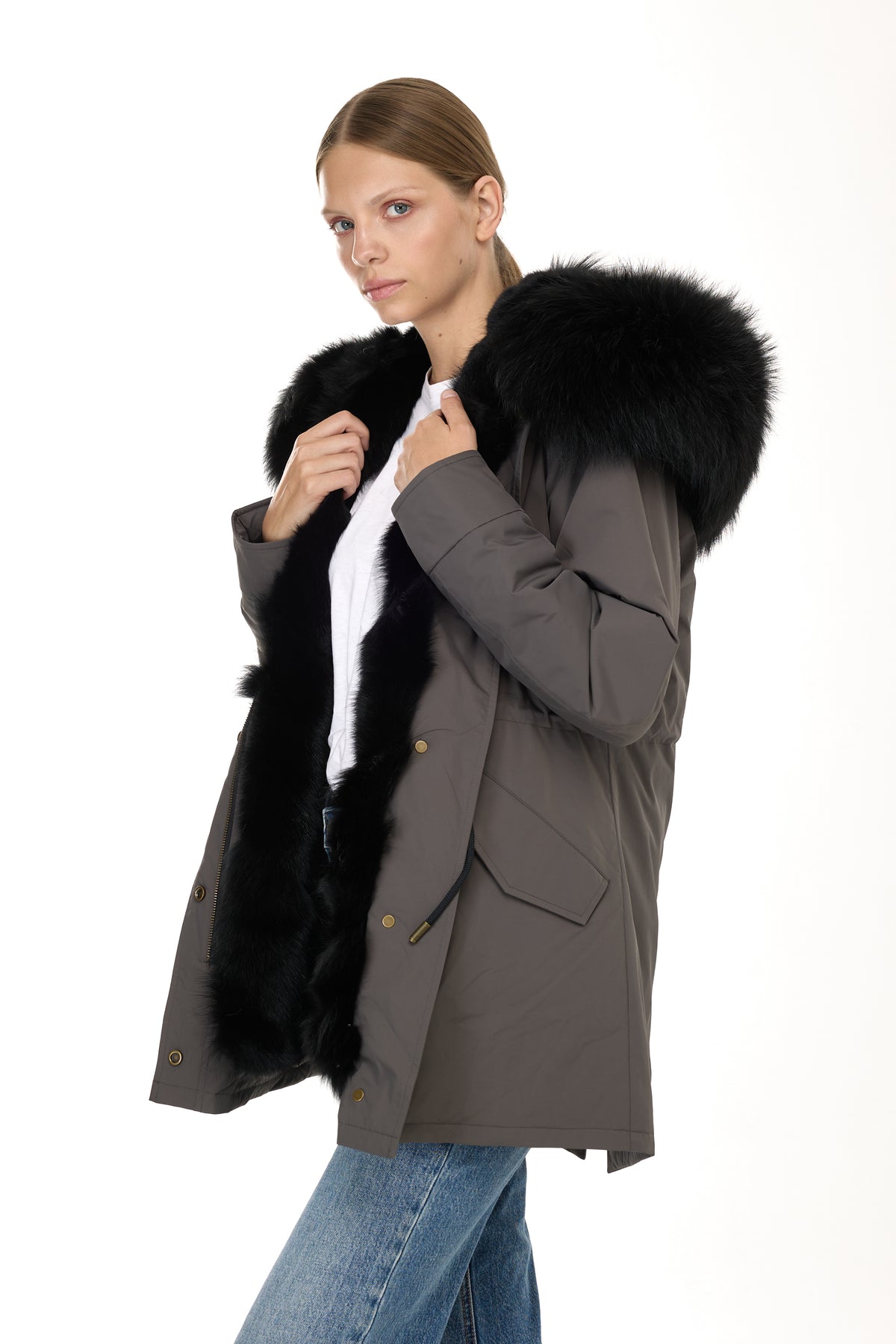 内側には本物のコヨーテファーのライニングが施され、暖かさと個性を演出します。取り外し可能なので、単独で着用できる独立したベストとして活用でき、最大限の自由度と汎用性を提供します。