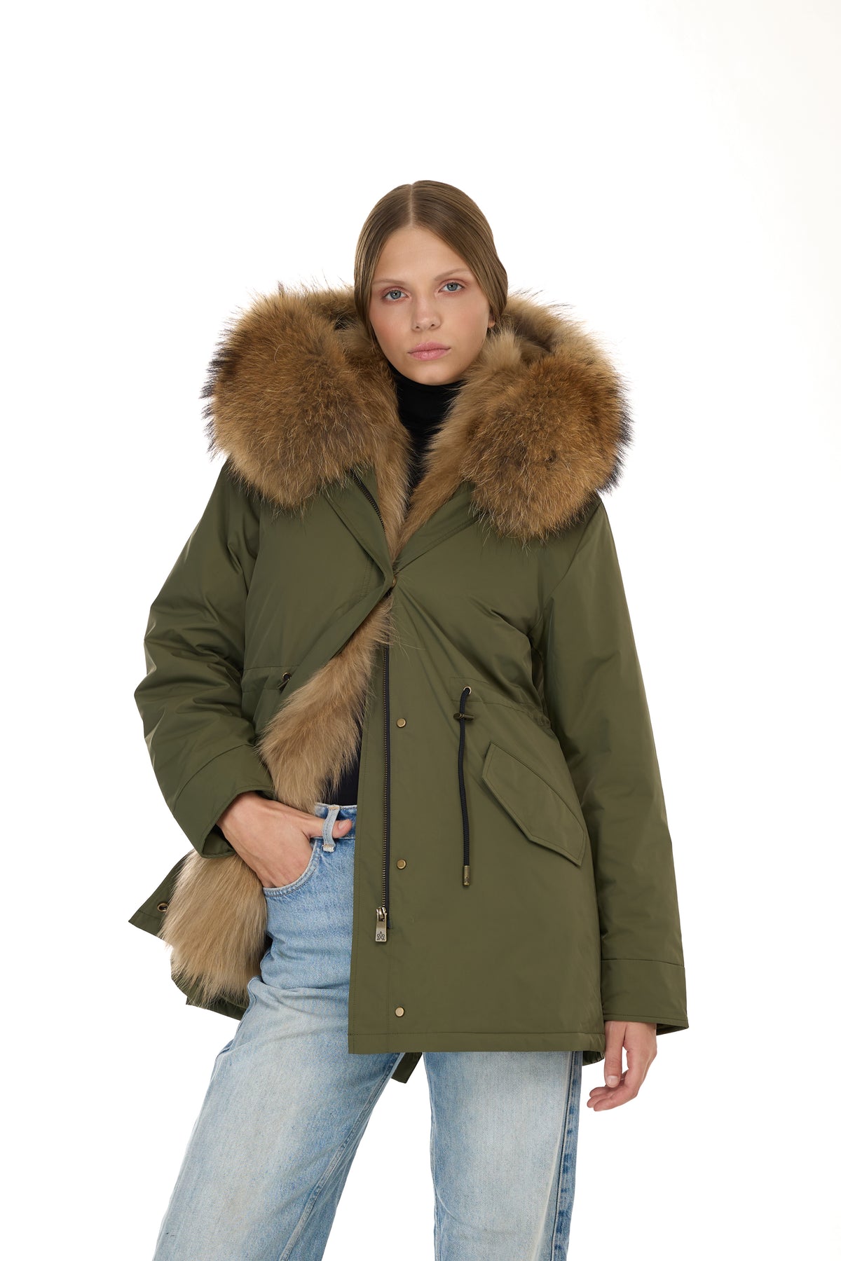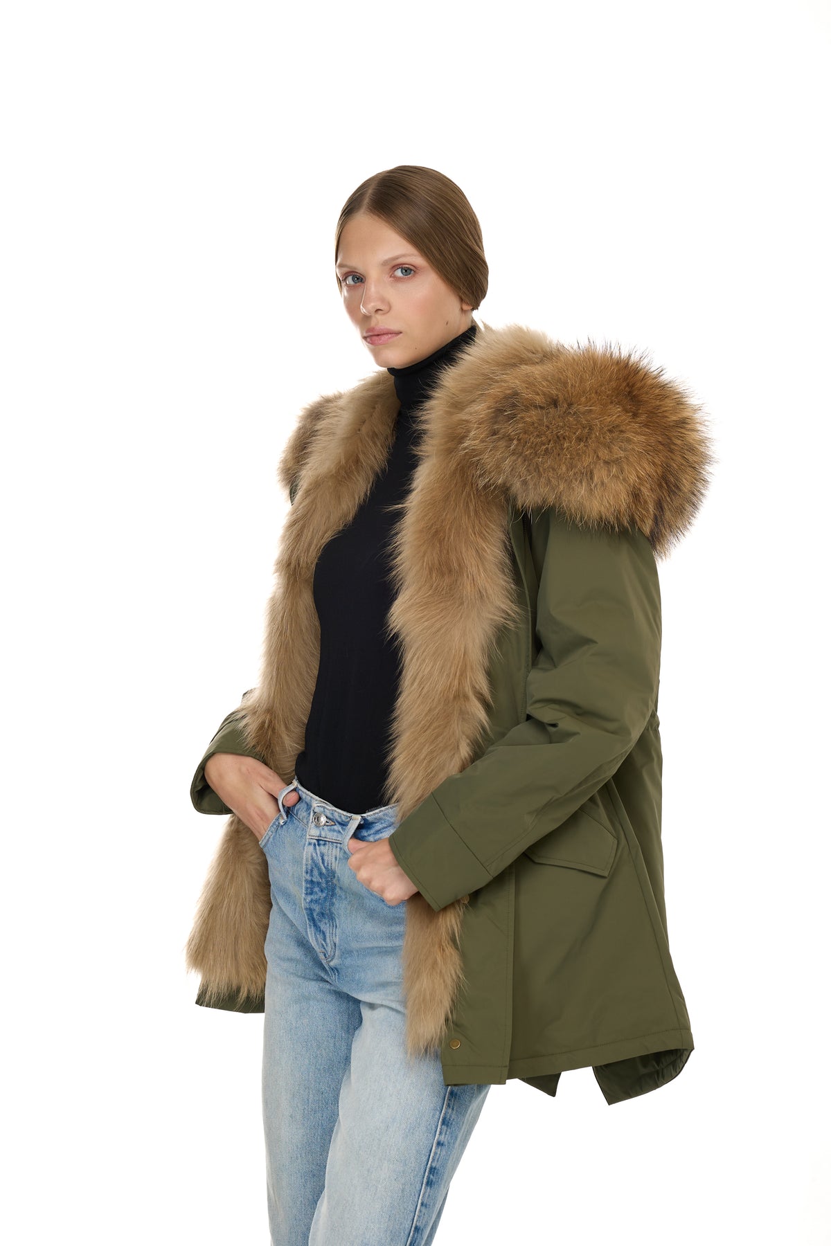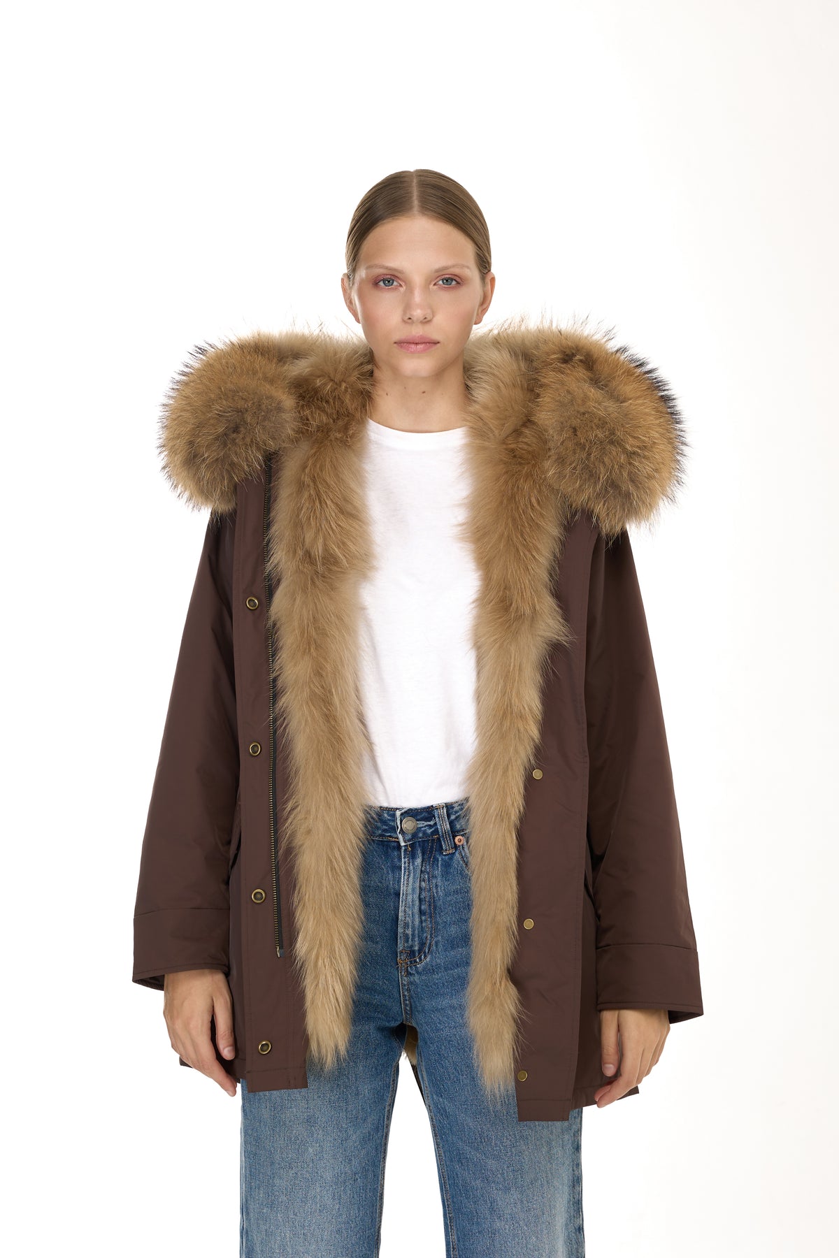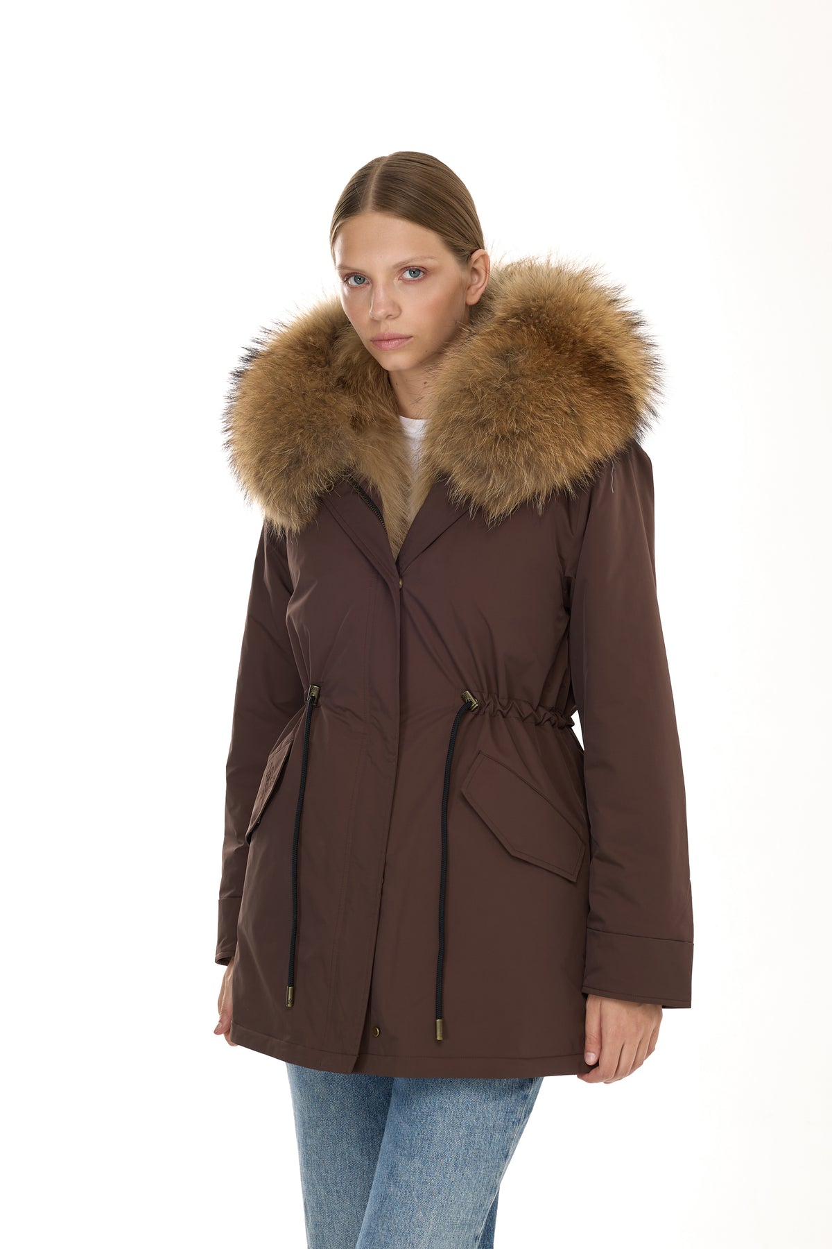 防水コットンブレンドとコヨーテファーベストの都市ロングパーカー - アライグマ